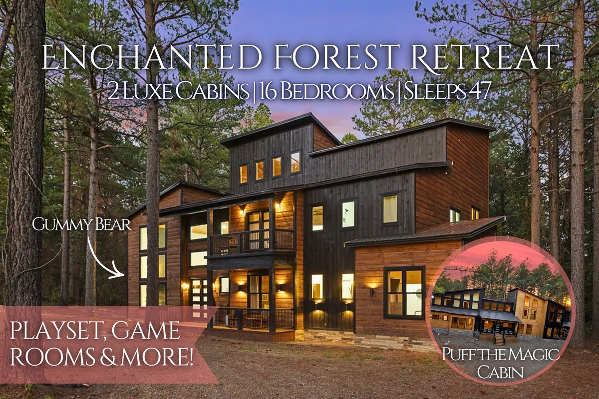 Enchanted Forest Retreat Luxe Side by Side Cabins w/Games, Sleeps 47