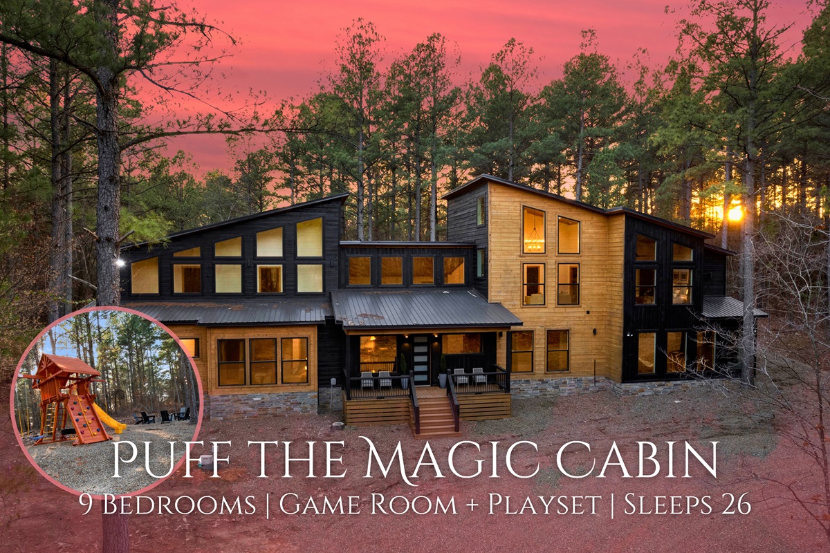 Puff The Magic Cabin is designed to host up to 24 guests with ease. This luxurious yet cozy cabin features 7 private king and queen bedrooms, each with an attached bath, plus a massive bunk room that sleeps 8. With smart TVs in every room, an outdoor kitchen, a game room complete with a pool table and basketball, and a relaxing hot tub, there's no shortage of entertainment or relaxation options. The outdoor playset and nearby firepit add to the charm, making this a place where everyone can feel at home.
