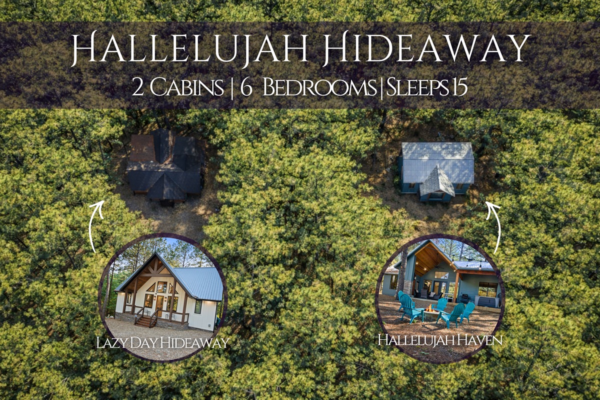 6 Bedrooms • 4 Bathrooms 4 Baths • Sleeps 9-15Tucked among the trees in beautiful Broken Bow this paired retreat, Hallelujah Hideaway, brings together the laid-back charm of Lazy Day Hideaway and the peaceful privacy of Hallelujah Haven. Together, these neighboring cabins offer the perfect setup for families and friends who want to vacation close to one another while still enjoying their own space. With modern, cozy interiors, inviting outdoor living areas, and room for everyone to spread out, this combined escape makes it easy to balance connection, comfort, and a little bit of adventure.