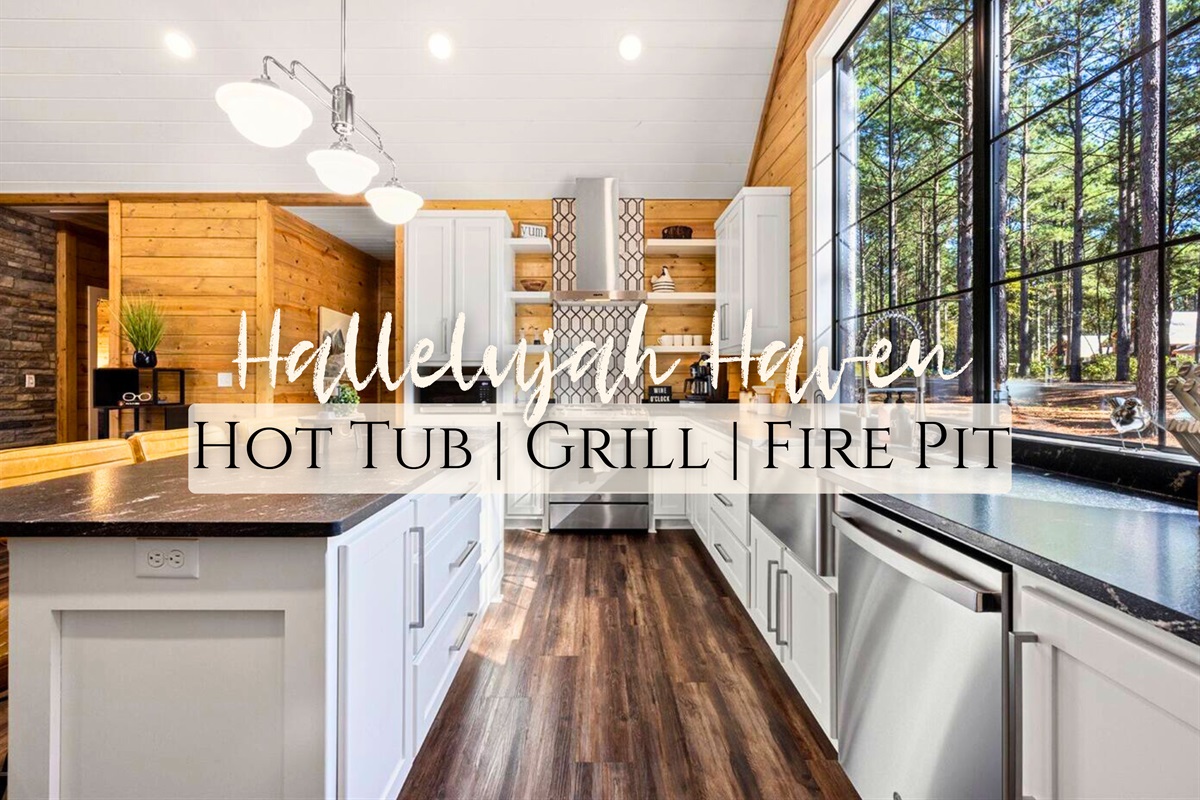 Just next door, Hallelujah Haven offers its own quiet retreat in the Cedar Hills neighborhood. With three bedrooms and two bathrooms, it comfortably sleeps seven and feels wonderfully tucked away, thanks to its private setting with no cabins behind or to the west. The back porch is made for slow mornings and relaxed evenings, featuring plenty of seating, a soothing hot tub, and a secluded fire pit perfect for conversation long after the sun goes down. It’s close enough to everything you’ll want to explore, yet far enough removed to skip the traffic and settle into vacation mode the moment you arrive.