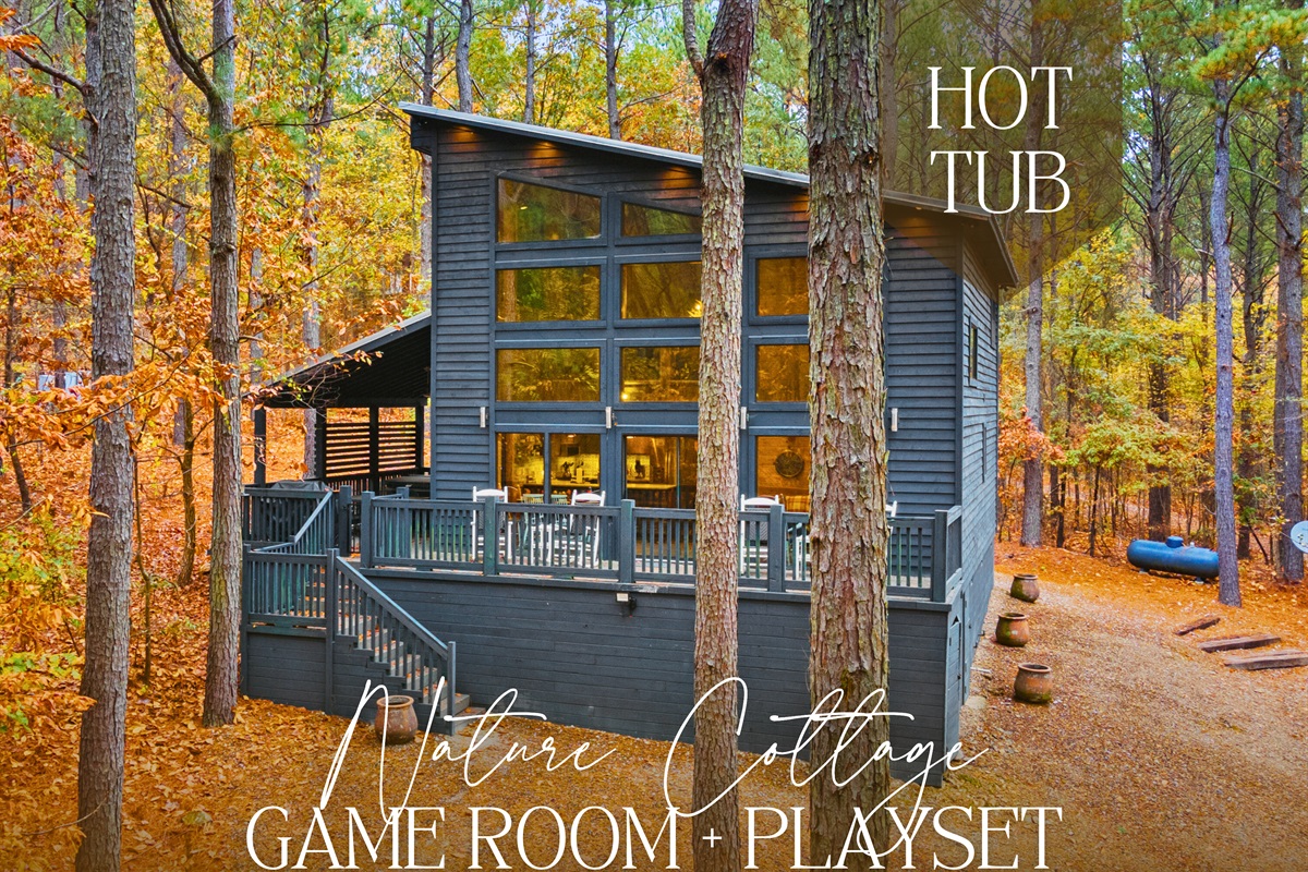 3 Bedrooms • 2 Bathrooms 2 Baths • Sleeps 6-8Tucked away in the serene beauty of the Ouachita Mountains, Nature Cottage offers a peaceful retreat on two acres of lush forestland. Located in the prestigious Southern Hills edition, this modern-rustic escape is the sister cabin to Nature House and was designed to blend seamlessly with its breathtaking natural surroundings. The spacious layout includes three bedrooms, two bathrooms, an open-concept living area, a game room, and a fully stocked kitchen—all framed by soaring walls of glass that bring the outdoors in.
