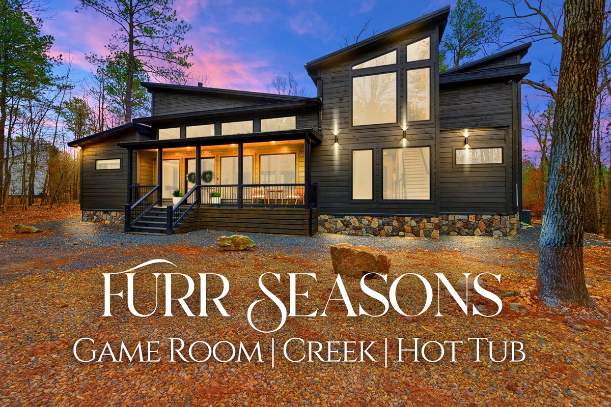 Furr Seasons rounds out Riverstone Estate with five thoughtfully designed bedrooms—four king suites and a bunk room—each inspired by a different season for a fun, cohesive feel. The open layout makes it easy to gather in the gourmet kitchen, dining area, and spacious living room anchored by a stone fireplace. An upstairs game room adds shuffleboard, arcade games, and board games, while the outdoor space features a covered hot tub overlooking the trees and creek, an outdoor fireplace with TV, a fire pit, and plenty of space to relax and reconnect.