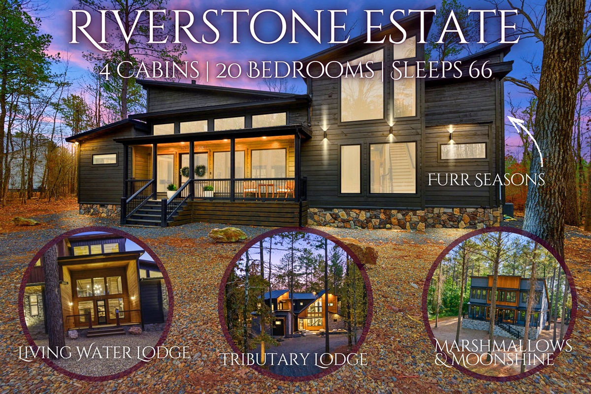 Riverstone Estate brings together four beautiful cabins—Living Water Lodge, Tributary Lodge, Marshmallow n Moonshine, and Furr Seasons—creating an ideal setup for large groups who want to stay close, spread out comfortably, and experience the best of Broken Bow together. Whether you’re planning a family reunion, a friends’ retreat, or a multi-family getaway, this estate offers the perfect blend of luxury, nature, and inviting spaces designed for connection and relaxation.