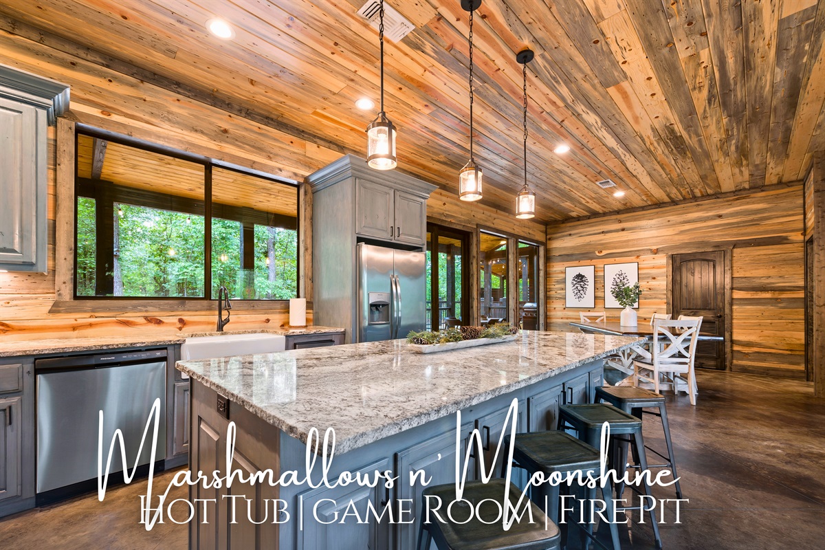 Marshmallow n Moonshine sits on a wooded hillside with sweeping views, rustic details, and modern comforts throughout. The open floor plan centers around a dramatic floor-to-ceiling stone fireplace, while the gourmet kitchen with its large granite island makes cooking and socializing feel effortless. Multi-level decks offer cozy spots for morning coffee, a lower lounge with a fireplace, and a private hot tub that’s perfect for winding down after a full day of adventure. With shuffleboard, a fire pit for s’mores, and hiking trails just steps away, this cabin strikes a great balance between relaxation and fun.