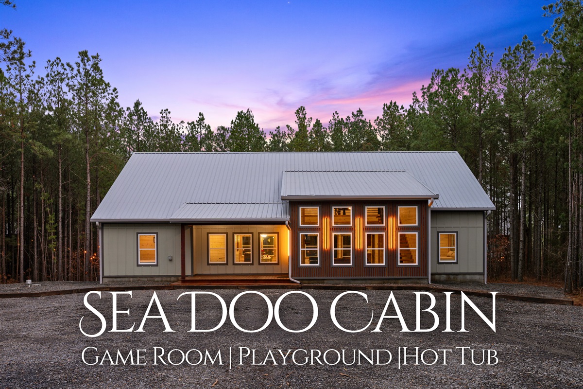 Outside, the cabin continues to shine with a large covered deck designed for relaxing and enjoying the fresh mountain air. Guests can gather around the outdoor fireplace, cook meals on the grill, practice their putting on the deck’s mini green, or soak in the hot tub while surrounded by peaceful forest views. The spacious yard features a playset, climbing dome, and fire pit with Adirondack chairs—perfect for roasting marshmallows and enjoying evenings under the stars. Located in Broken Bow, Oklahoma, Sea Doo Cabin places you close to all the area’s most popular attractions, including Broken Bow Lake, Beavers Bend State Park, hiking trails, fishing spots, and the restaurants and shops of nearby Hochatown, making it easy to enjoy both outdoor adventure and laid-back cabin relaxation.