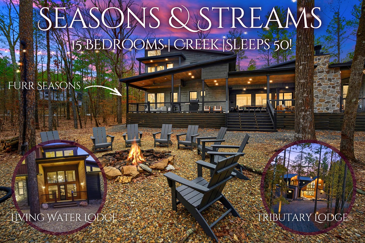 Seasons & Streams brings together three beautiful cabins—Living Water Lodge, Tributary Lodge, and Furr Seasons—creating an ideal retreat for groups who want to stay close while still enjoying their own space. Perfect for family gatherings, friend getaways, or multi-family trips, this combination offers a relaxed blend of comfort, thoughtful design, and peaceful natural surroundings in the heart of Broken Bow.
