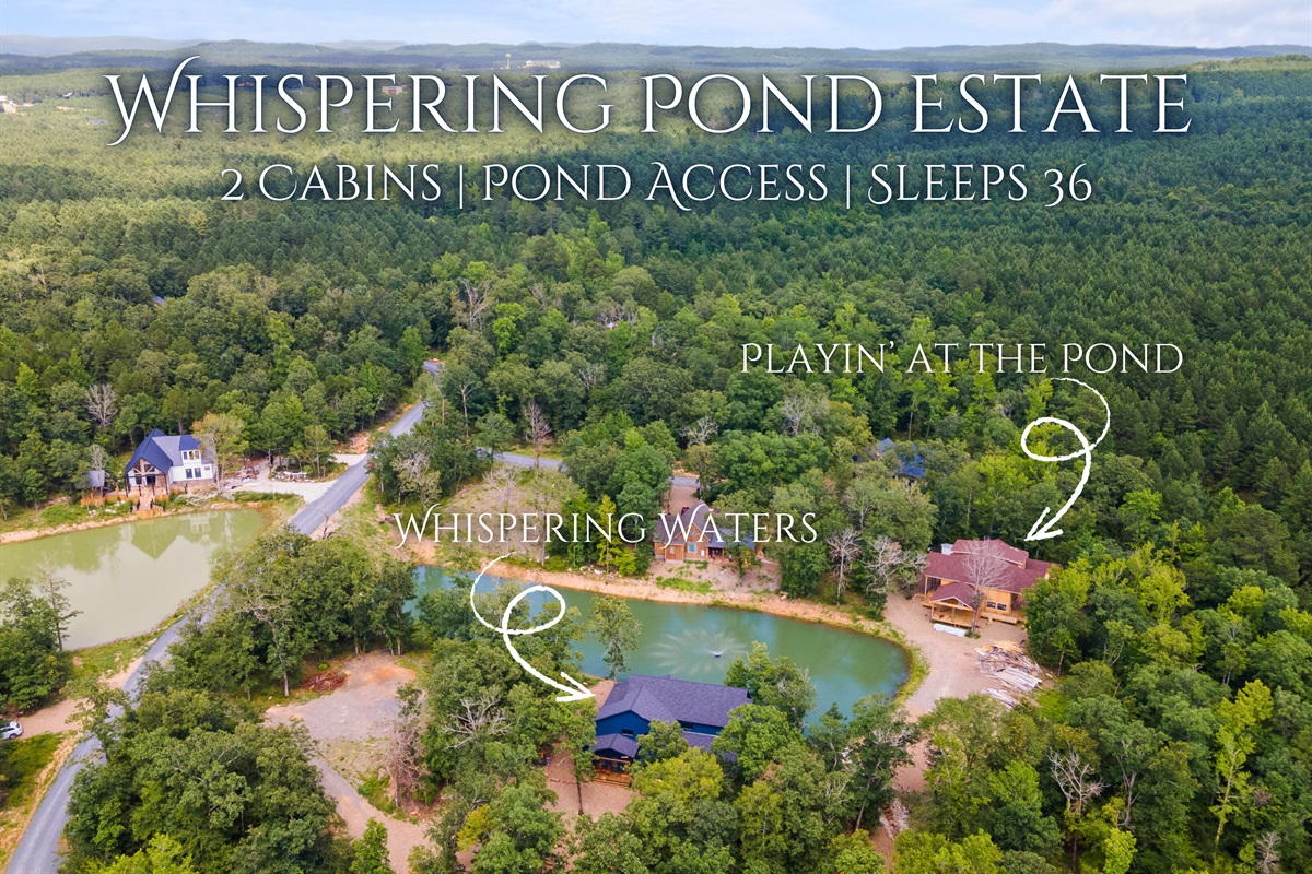 9 Bedrooms • 9 Bathrooms (8 full, 1 half) 9 Baths (8 full, 1 half) • Sleeps 18-36Whispering Pond Estate brings together two beautiful side-by-side cabins to create the perfect retreat for large groups. With room for up to 36 guests, 9 bedrooms, and 9.5 bathrooms across both homes, this combined property gives everyone plenty of space to relax while still keeping the group together. It’s an ideal setup for family reunions, corporate retreats, or big friend getaways where shared moments matter just as much as having room to spread out. Even better, both cabins are pet friendly, so your four-legged family members are welcome to join the adventure too. Between the peaceful pond views, inviting outdoor spaces, and cozy interiors, it’s easy to settle in and feel right at home.