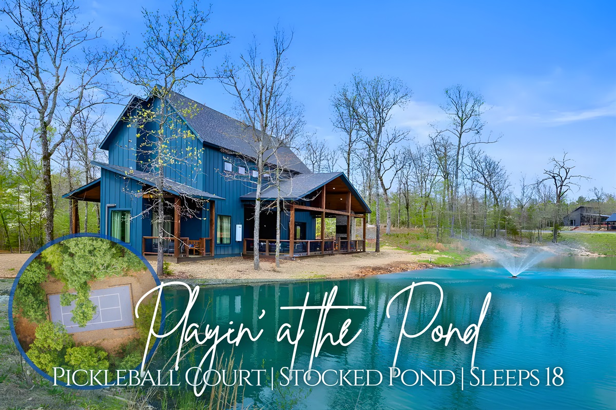 Next door, Playin’ at the Pond brings even more space and fun to the property. The cabin includes three sleeping areas in the main house along with an additional sleeping space in the small house, plus 4.5 bathrooms to keep everyone comfortable. The open layout invites everyone to gather, while cozy corners provide quiet places to recharge. Outside is where the adventure really begins, with activities like pickleball, tennis, basketball, and horseshoes ready for friendly competition. When it’s time to relax, you can soak in the hot tub, gather around the fire pit for s’mores, or simply unwind in one of the covered seating areas overlooking the pond.